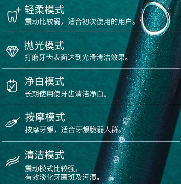 【S300 智能声波电动牙刷】在性能上也同样优秀,模式记忆功能,电动牙刷停止刷牙运行后,下次即可继续使用上次的刷牙模式,甩掉再次选择模式的苦恼。此外,在外观上,这款成人敏感牙龈电动牙刷也很受都市白领们的欢迎。一键式的全功能切换简约设计,契合简约美感;同时颜色的搭配上,抛开了千变一律的黑白色调,采用多种高颜值的色彩点缀,满足不同了风格人群的使用,例如:皓月白的优雅、睿智黑的炫酷、深邃蓝的庄重及冷光蓝、冷光绿的舒缓及深远……