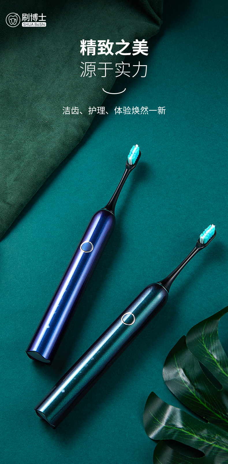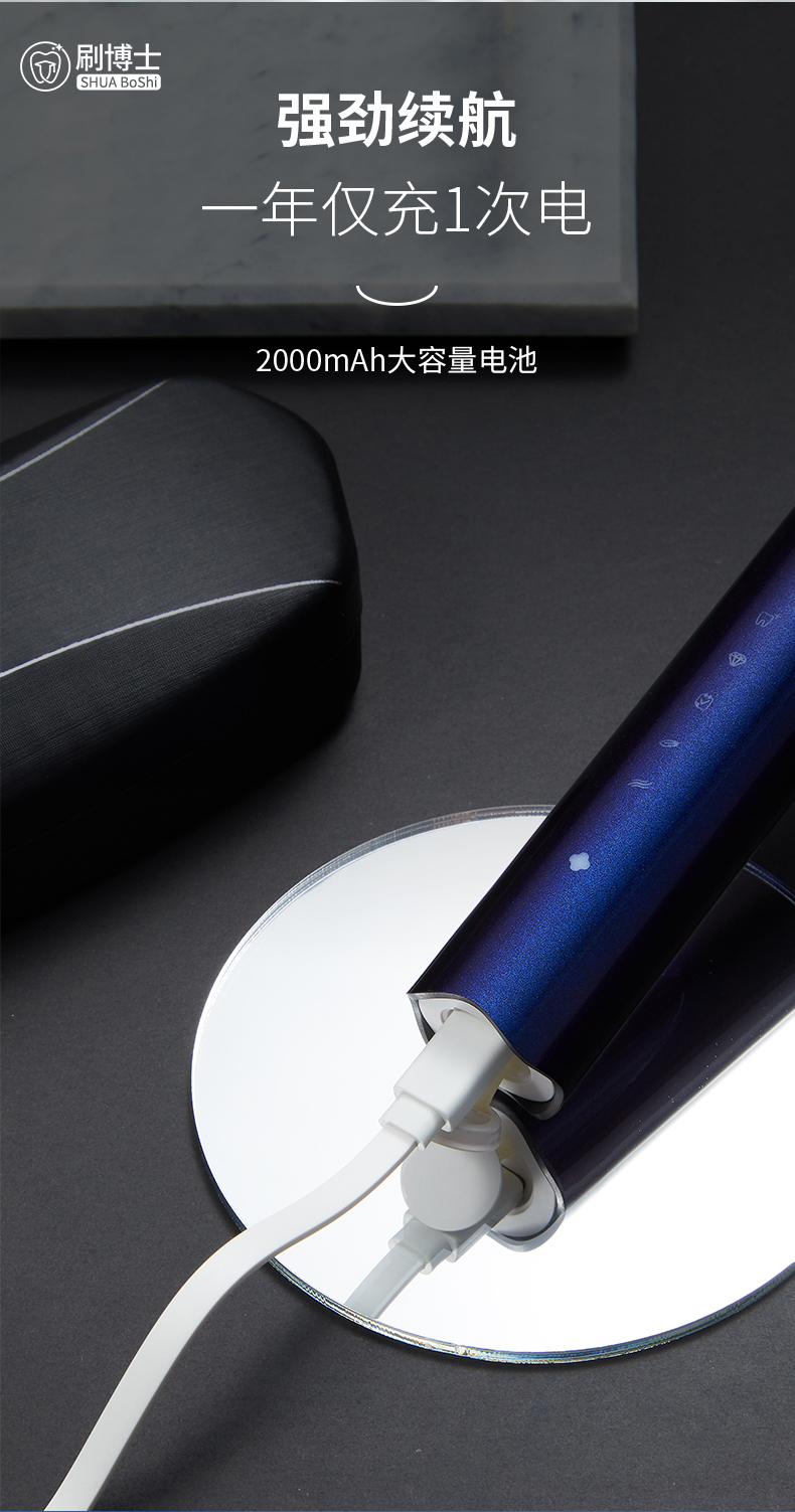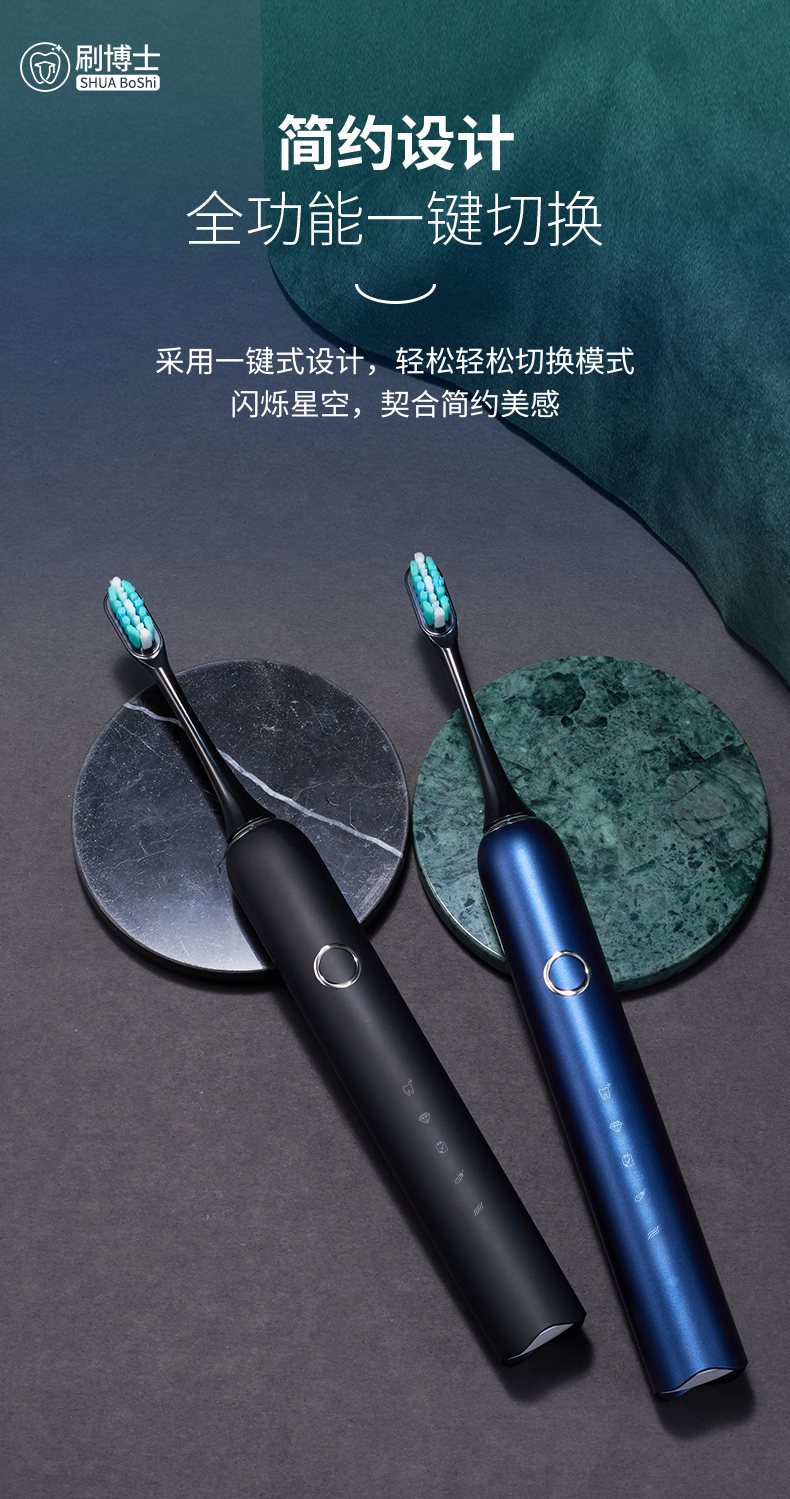 刷博士【S300智能声波电动牙刷】是一款集洁齿、护理及体验焕然一新于一身的多功能声波电动牙刷,采用一键式的简约设计,5档清洁模式,随心掌控;此外,植入了模式记忆功能,牢牢记住你的刷牙习惯,下次刷牙,无需费时再次选择;强劲的续航功能,一年仅充1次电;高颜值的颜色设计,皓月白、睿智黑、深邃蓝等多种颜色选择,遇上不同风格的你。