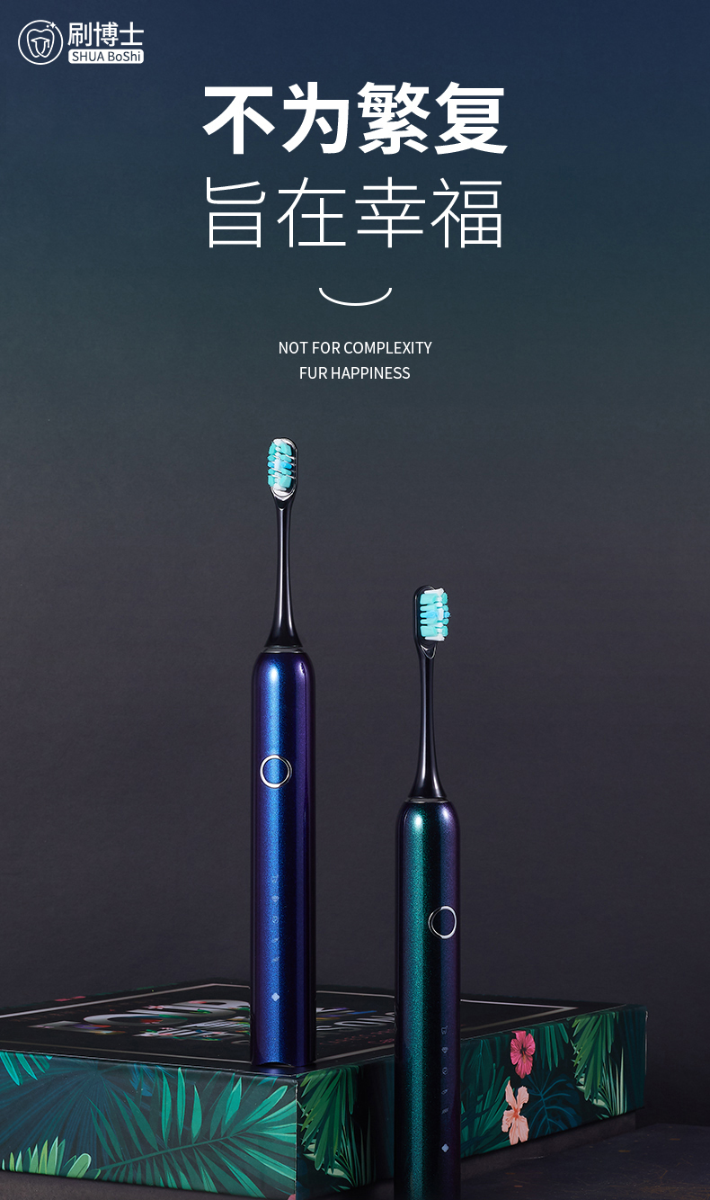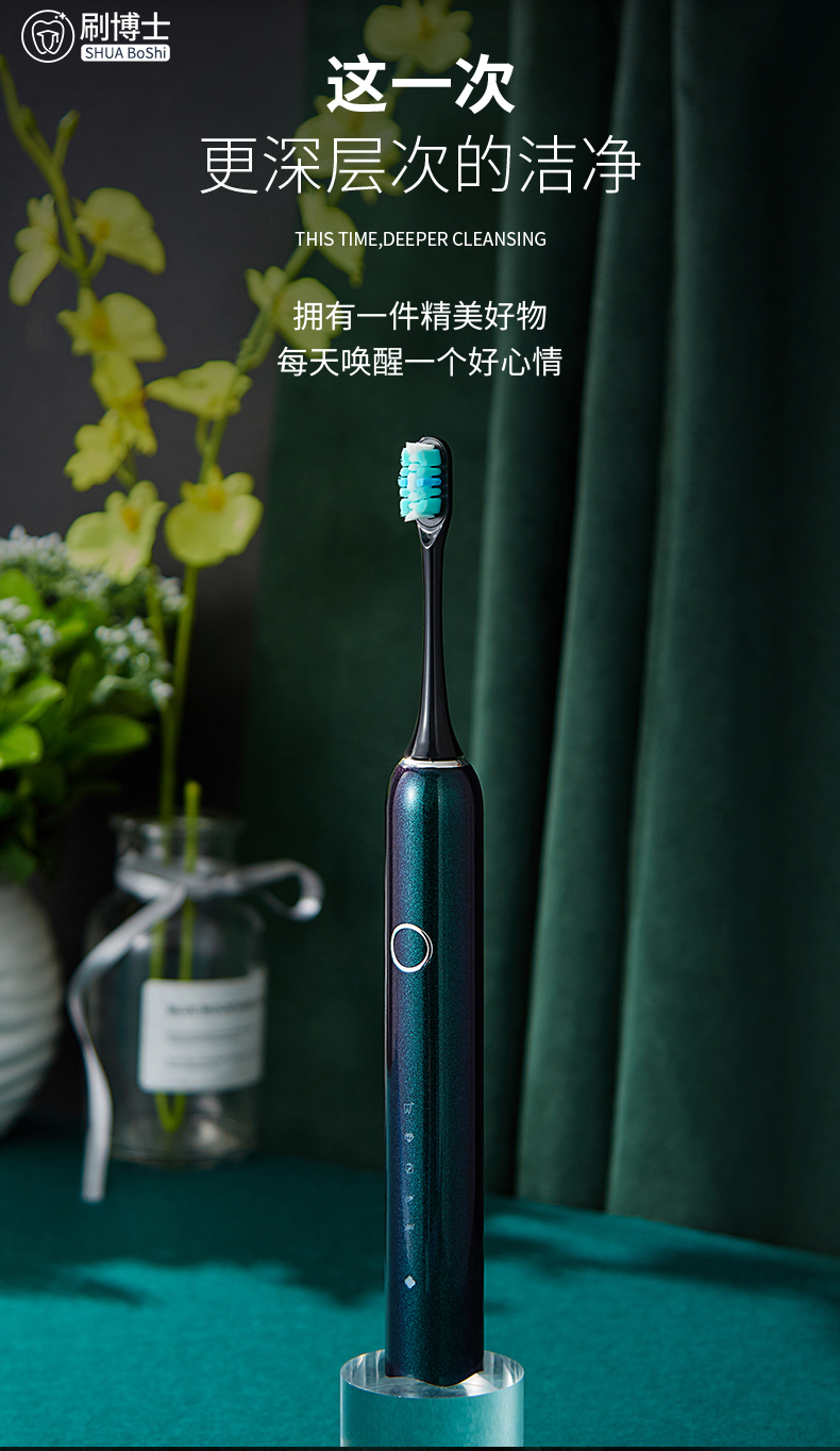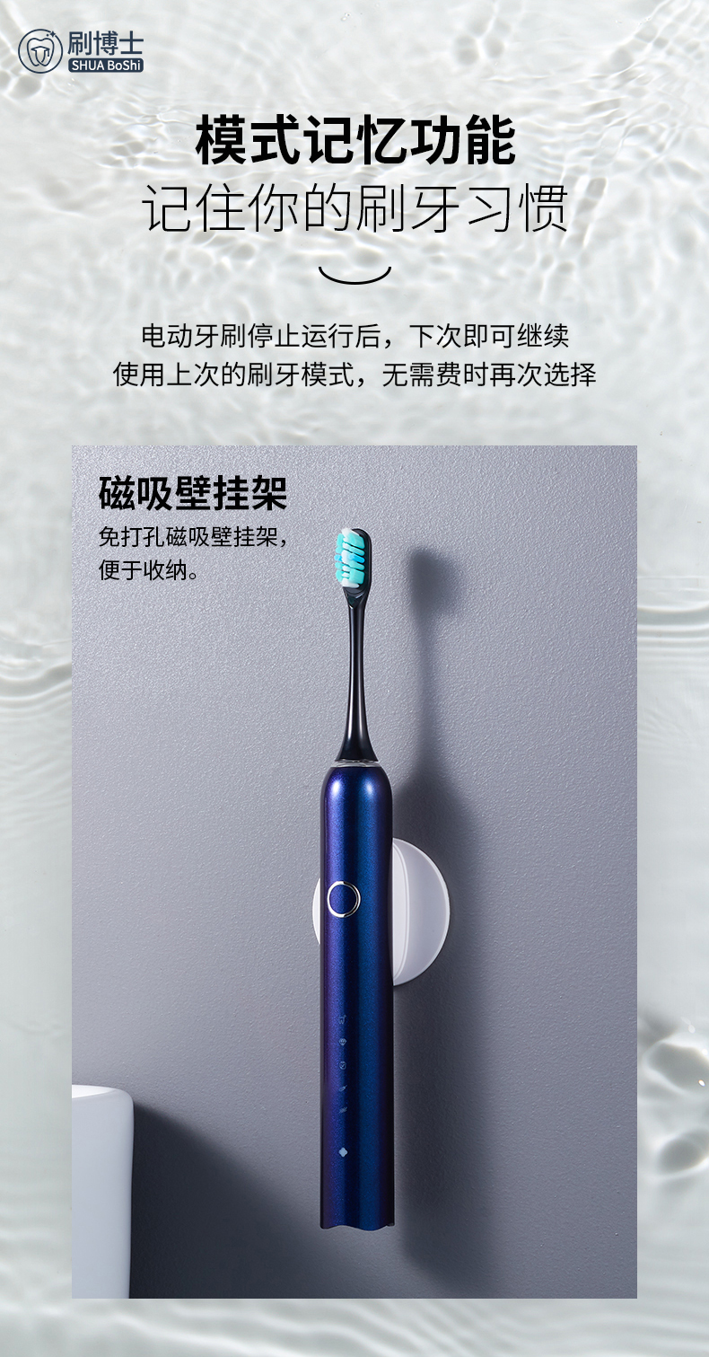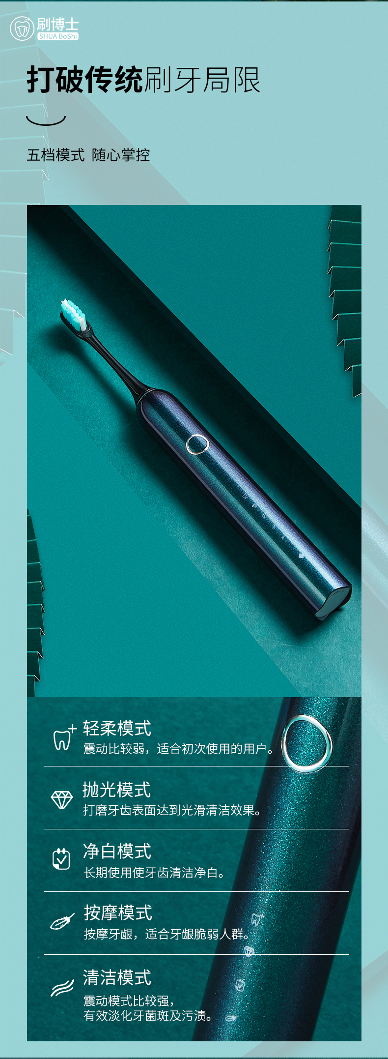 刷博士【S300智能声波电动牙刷】是一款集洁齿、护理及体验焕然一新于一身的多功能声波电动牙刷,采用一键式的简约设计,5档清洁模式,随心掌控;此外,植入了模式记忆功能,牢牢记住你的刷牙习惯,下次刷牙,无需费时再次选择;强劲的续航功能,一年仅充1次电;高颜值的颜色设计,皓月白、睿智黑、深邃蓝等多种颜色选择,遇上不同风格的你。
