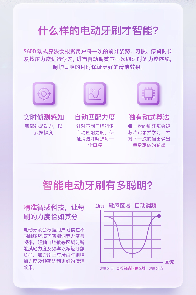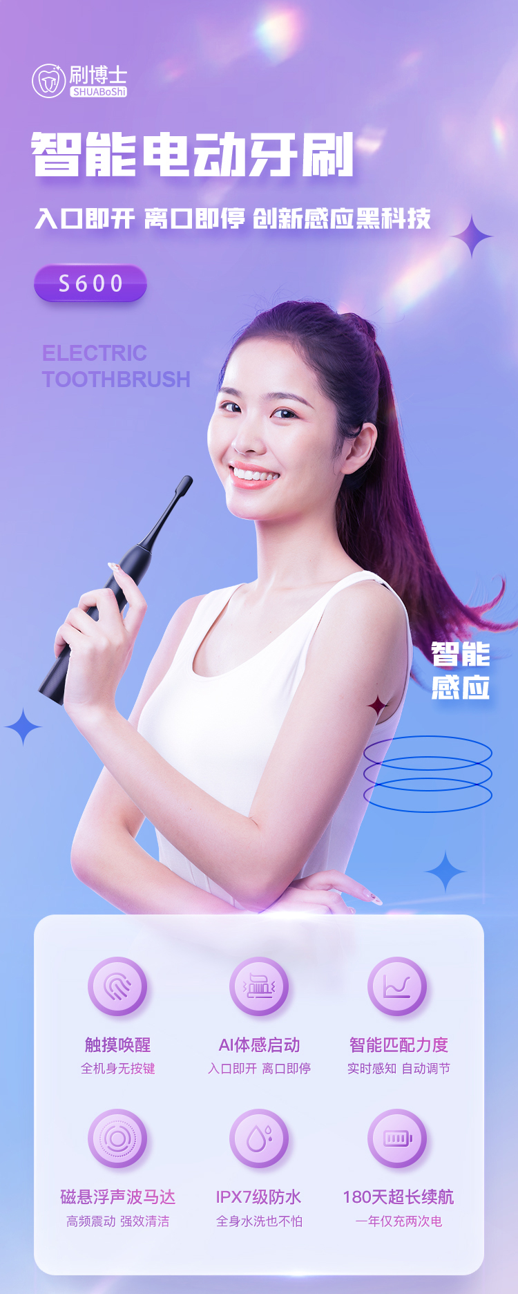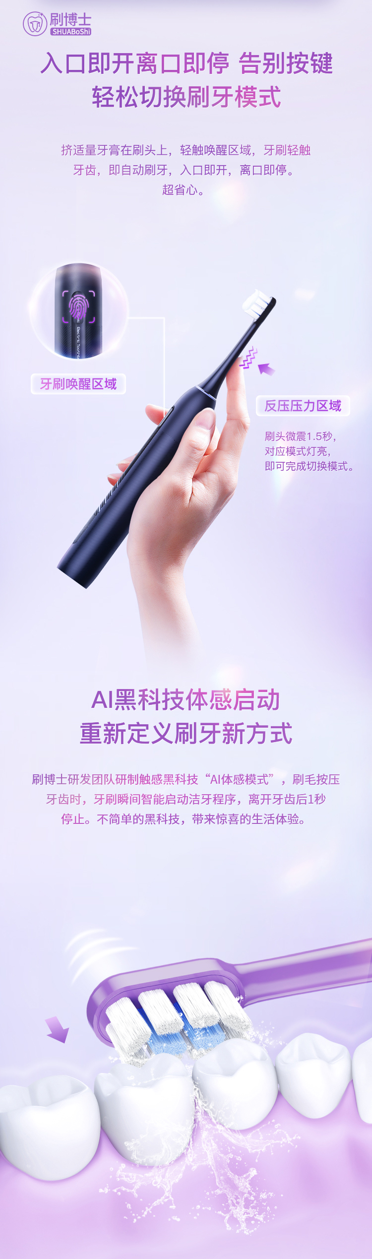 【S600 AI黑科技电动牙刷】是刷博士研发团队研制触感黑科技“AI体感模式”的一款科技感满满的新型智能电动牙刷。例如:刷毛感应模式,刷毛按压牙齿时,牙刷可瞬间智能化地启动洁牙程序,离开牙齿后1秒便自动停止;智能贴心感应设计,刷头离开牙面,振动智能便自动减弱,再也不用担心牙面泡面乱飞;自动休眠模式,居家、差旅皆可无忧使用……