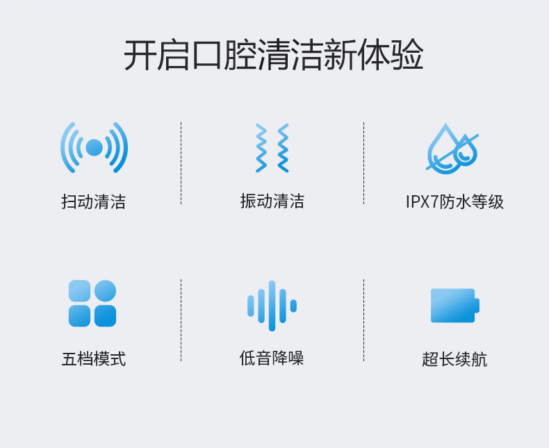 1、扫振适配刷头:贴合齿面全覆盖,灵活深入牙缝、牙龈沟,无清洁盲区?
