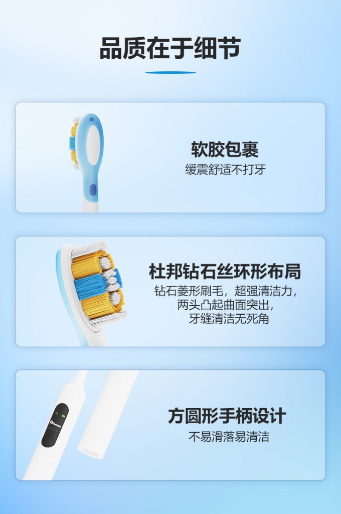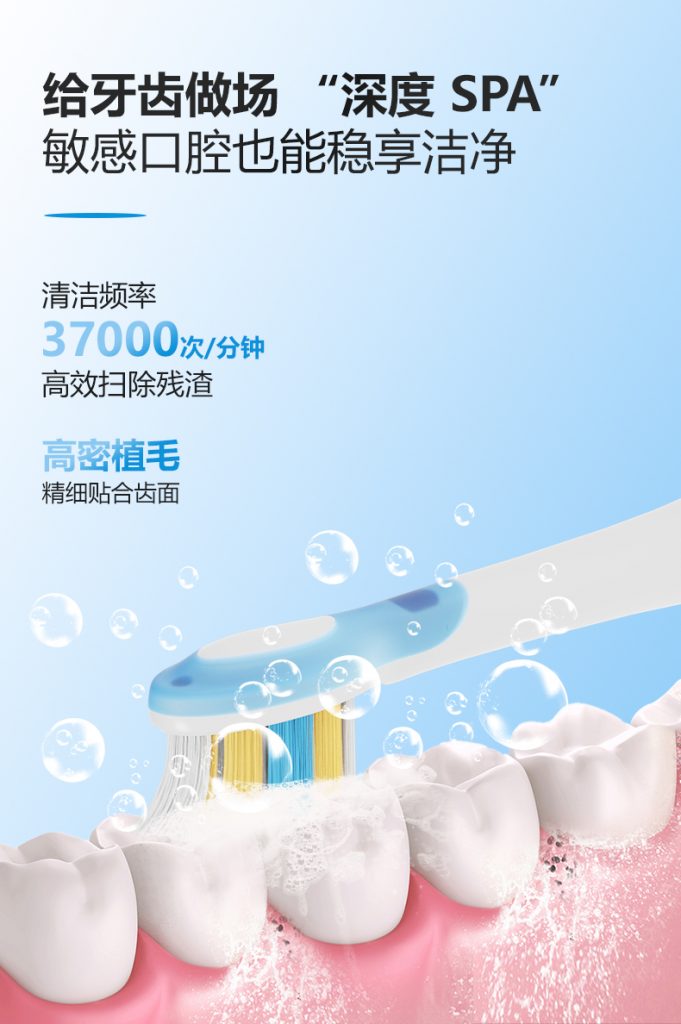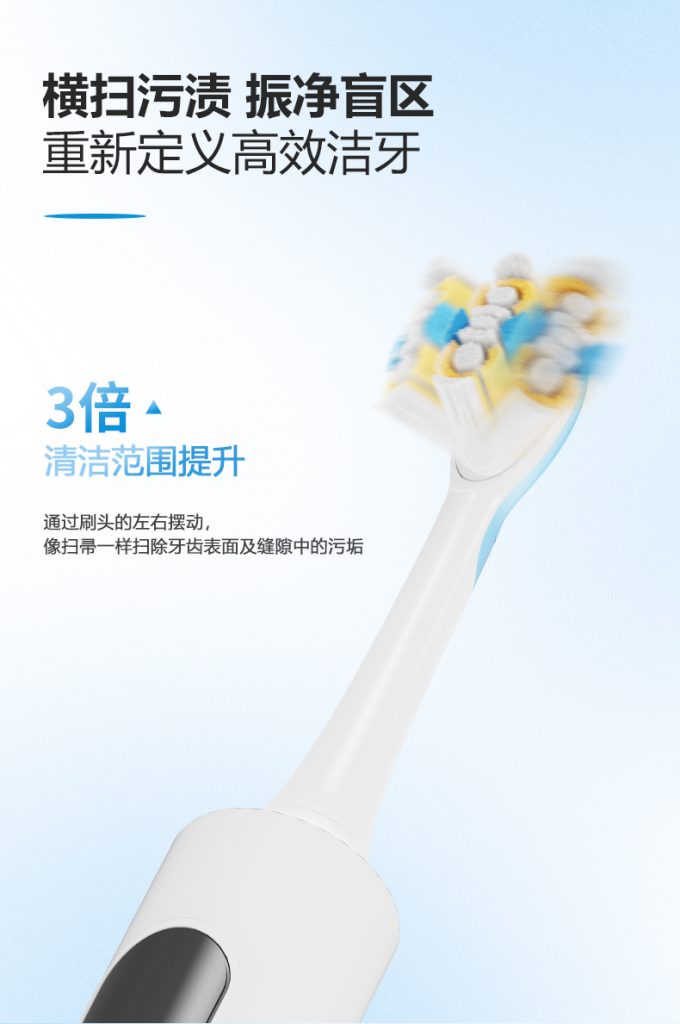 3、高密植毛刷面:3 倍清洁范围,一次清洁更广区域,提升洁齿效率?