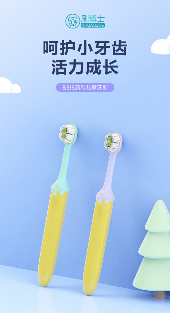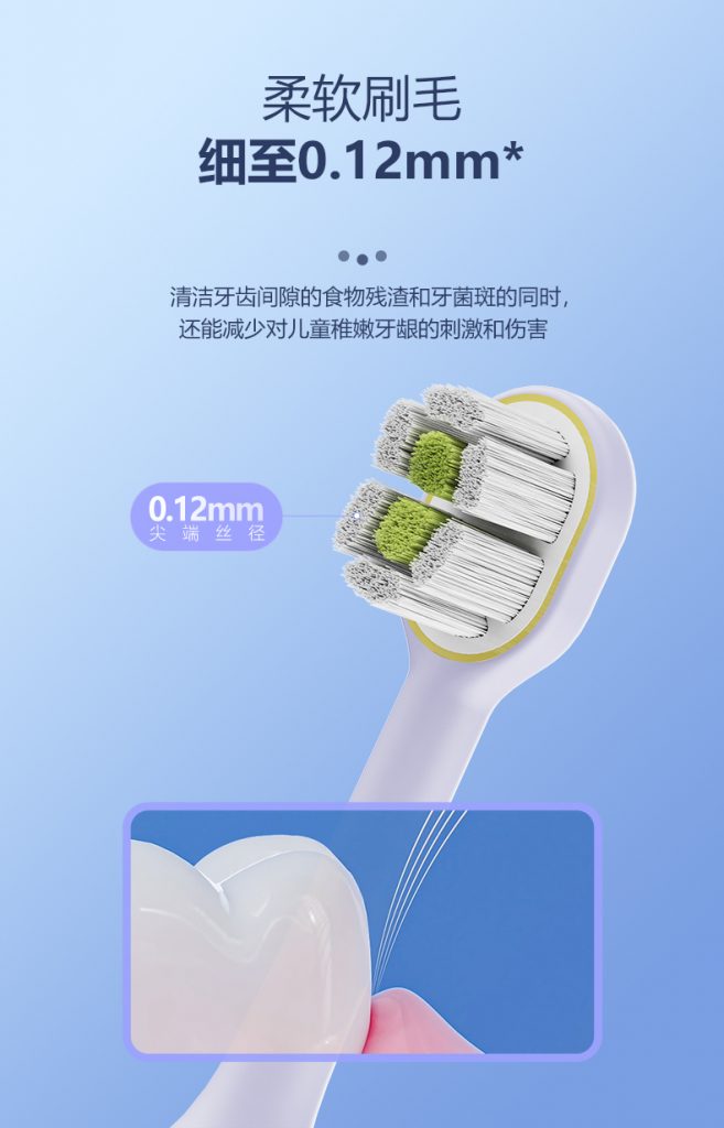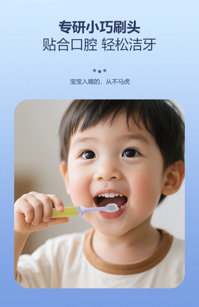 1、小巧设计,贴合儿童口腔,适配乳牙清洁场景