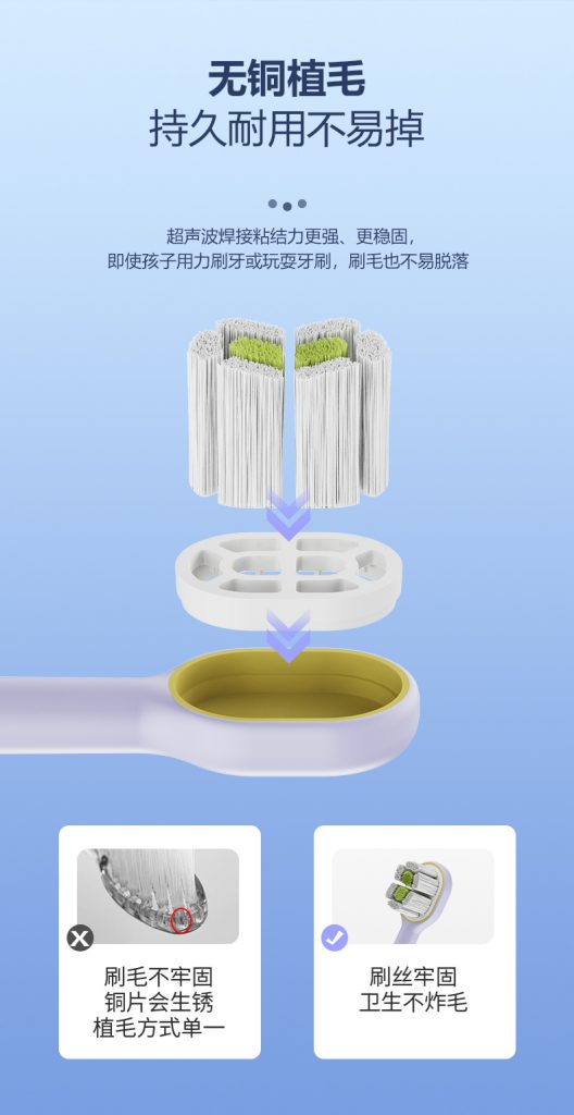 3、无铜植毛 + 超声波焊接,刷毛牢固,经得住孩子折腾