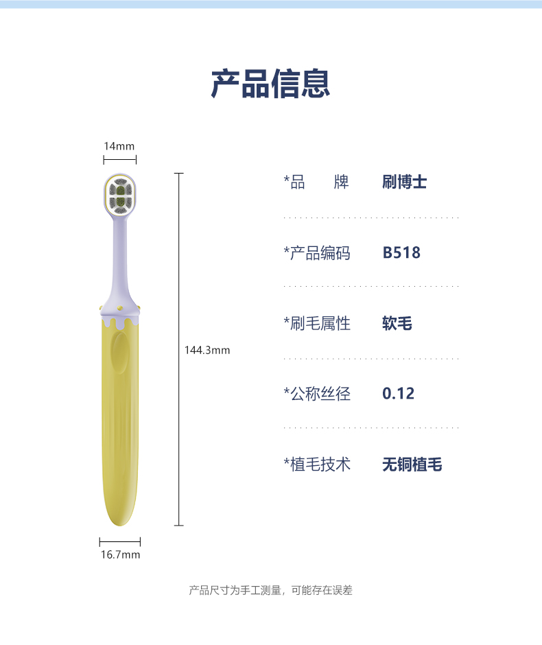 刷博士B508儿童牙刷采用0.12mm云感超细软毛,双重软毛组合,温柔包裹小小萌牙,在清洁牙齿间隙食物残渣与牙菌斑时,减少对稚嫩牙龈的刺激;一体成型防吞食刷头,严守安全标准,搭配加宽防滑防深喉挡片,有效阻挡牙刷深入口腔,避免孩子误吞风险;无铜植毛技术让刷毛持久耐用,超声波焊接不易脱落;童趣造型与多色可选,配合可放平设计、圆润凸点舌苔刷、海豚手柄及防滑波浪纹,助力宝贝养成刷牙好习惯,360°守护口腔健康。